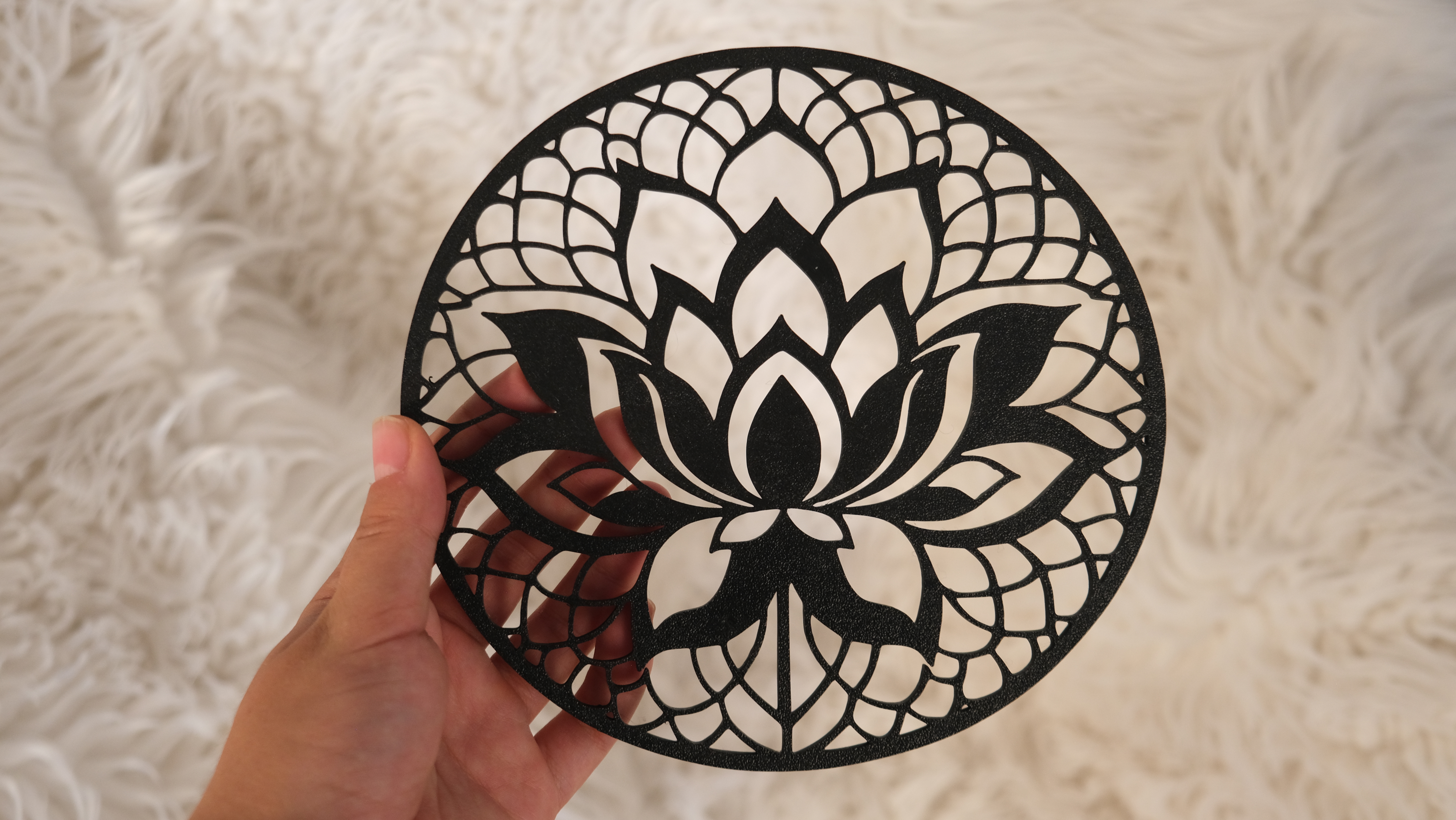 Zarif lotus çiçeği formu ve mandala detaylarıyla tasarlanan bu dekoratif duvar süsü, yaşam alanlarınıza huzurlu ve estetik bir dokunuş katar. Minimal siyah rengi sayesinde farklı dekorasyon stilleriyle kolayca uyum sağlar.