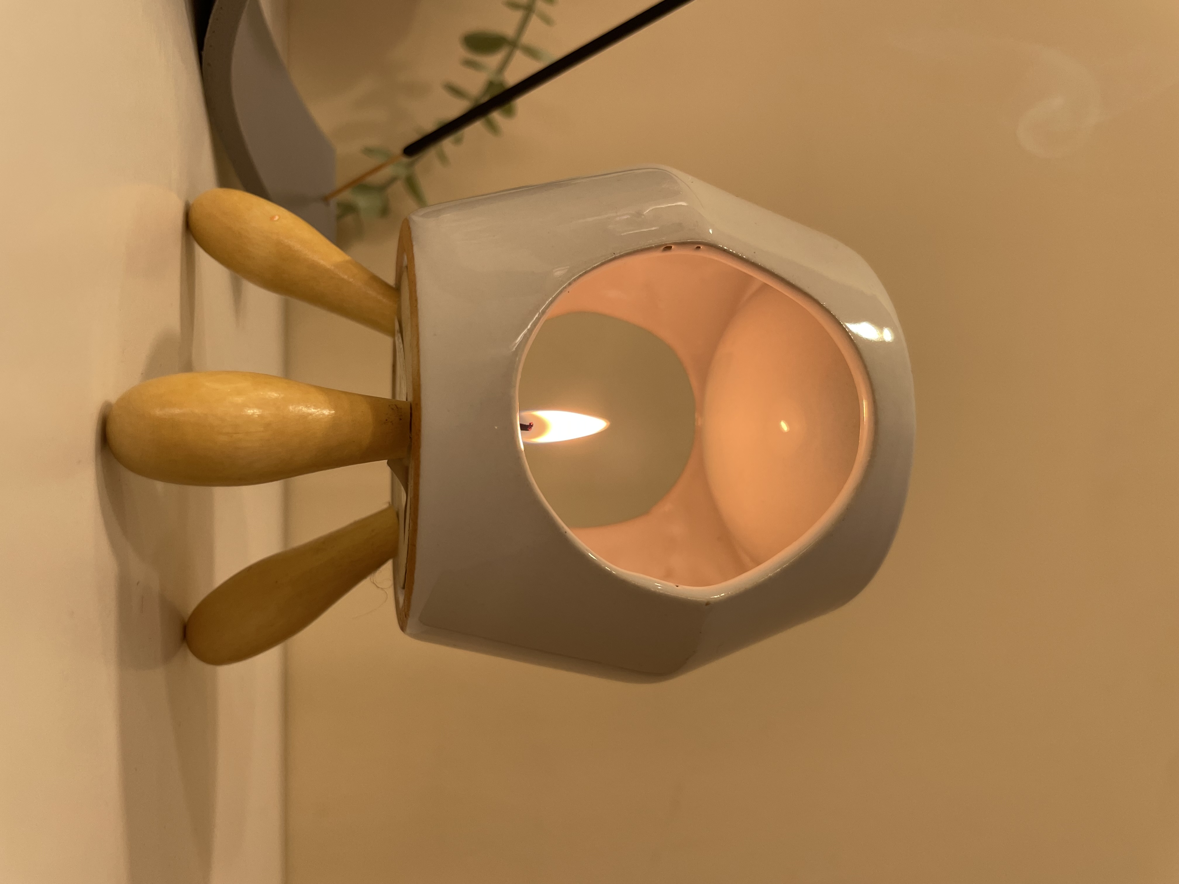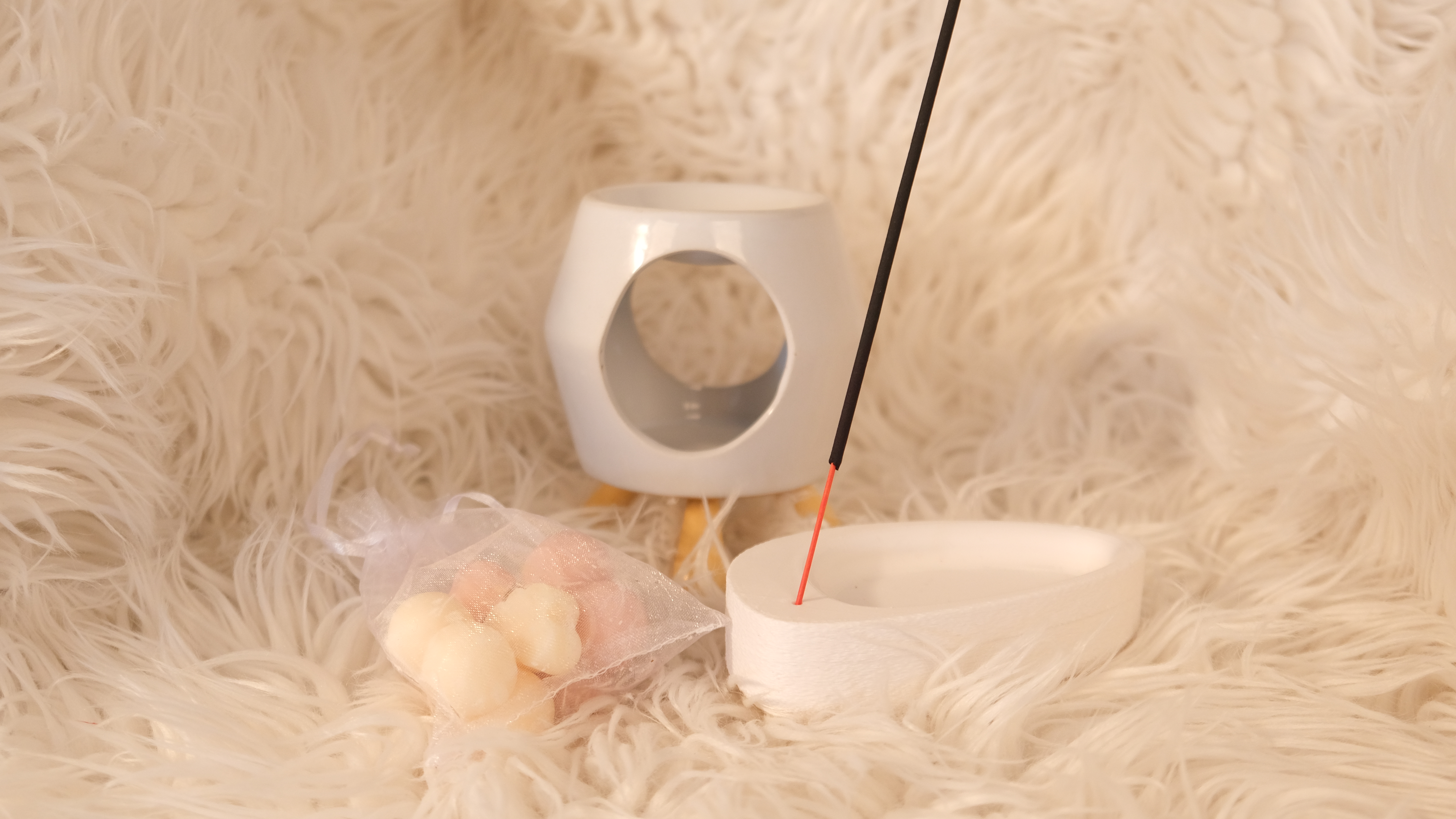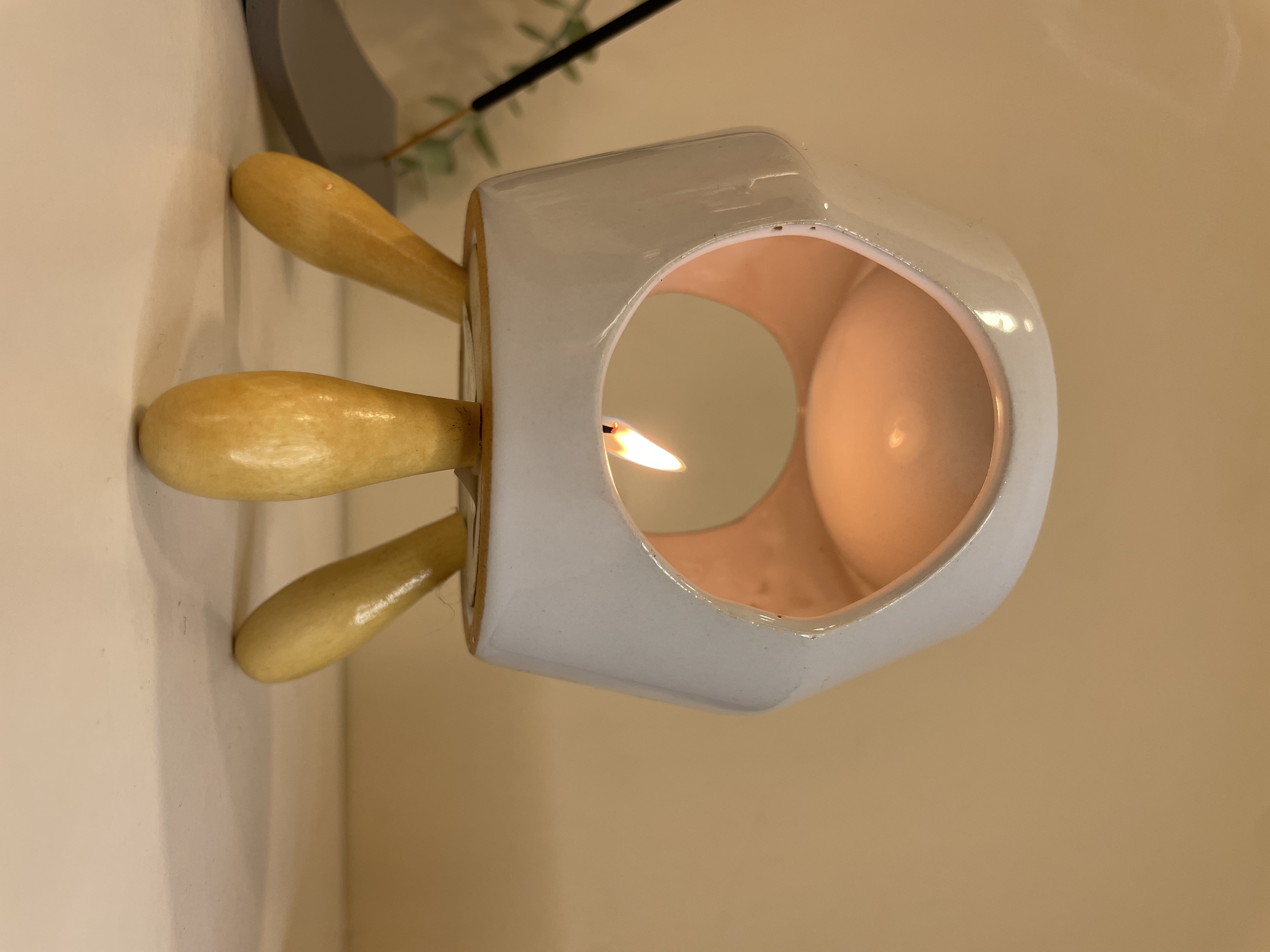 Minimalist tasarımıyla beyaz seramik buhurdanlık, portakal kokulu buhurdanlık mumu, tütsülük ve tütsüleriyle evinize dinginlik katıyor.