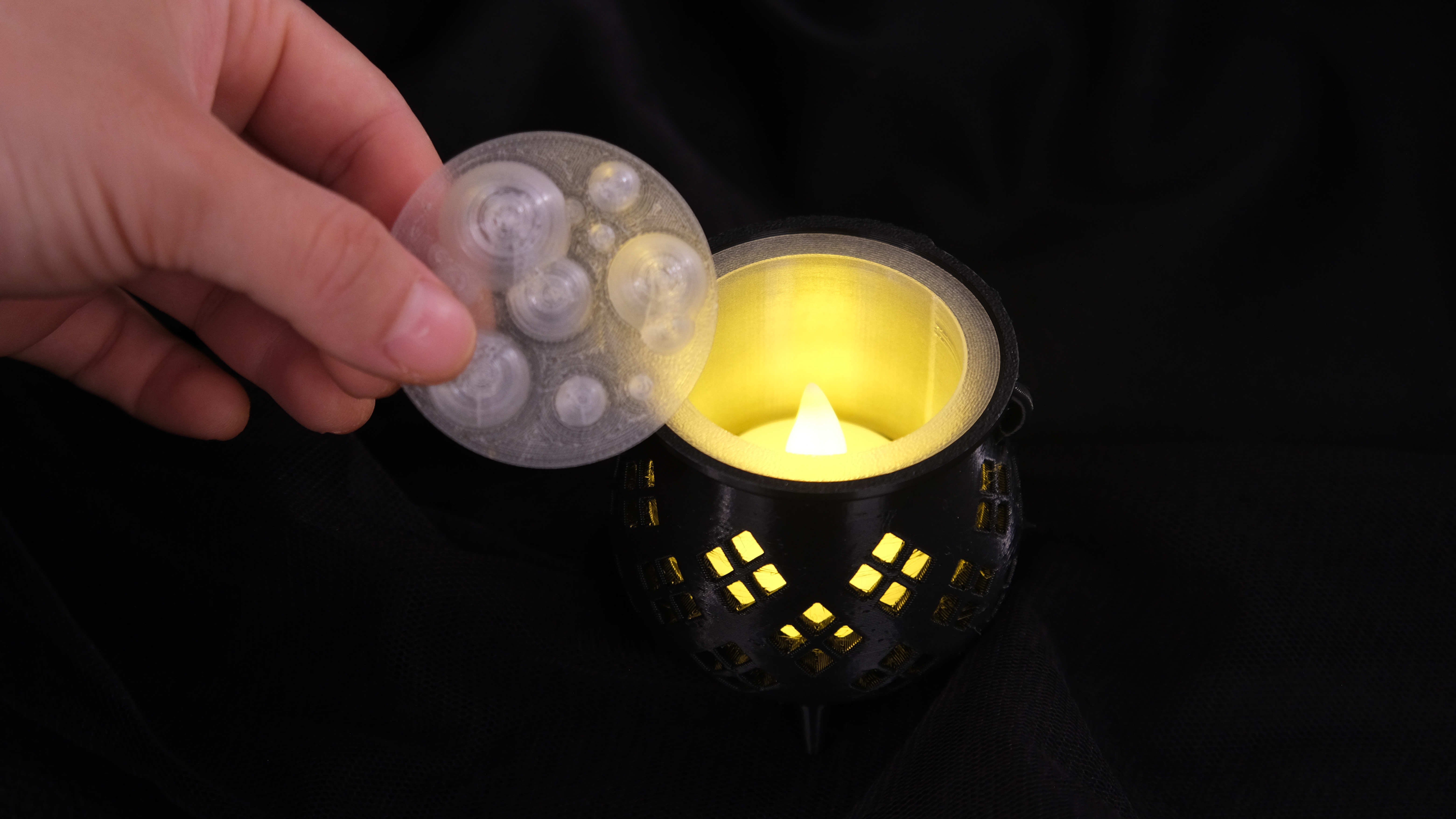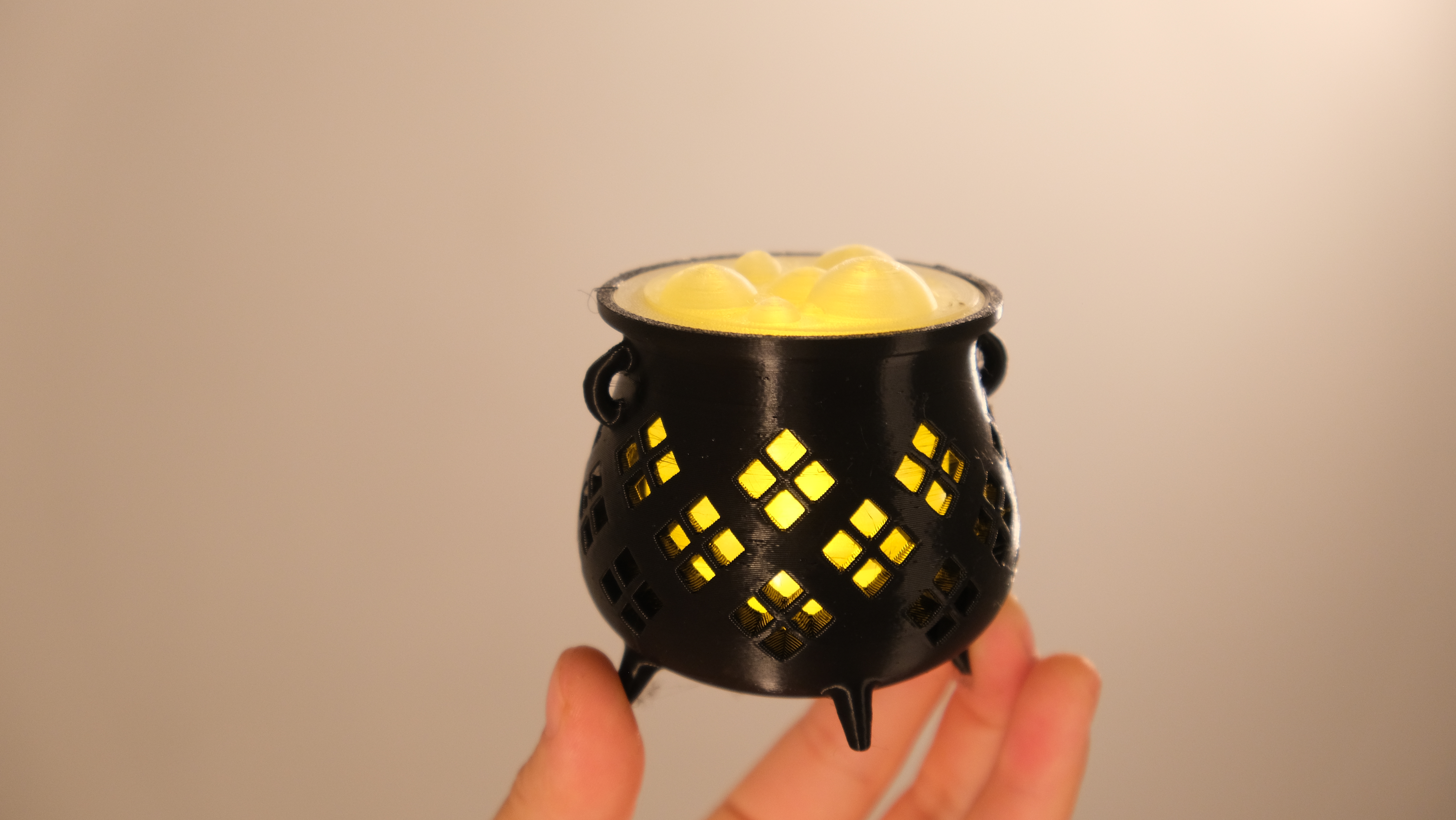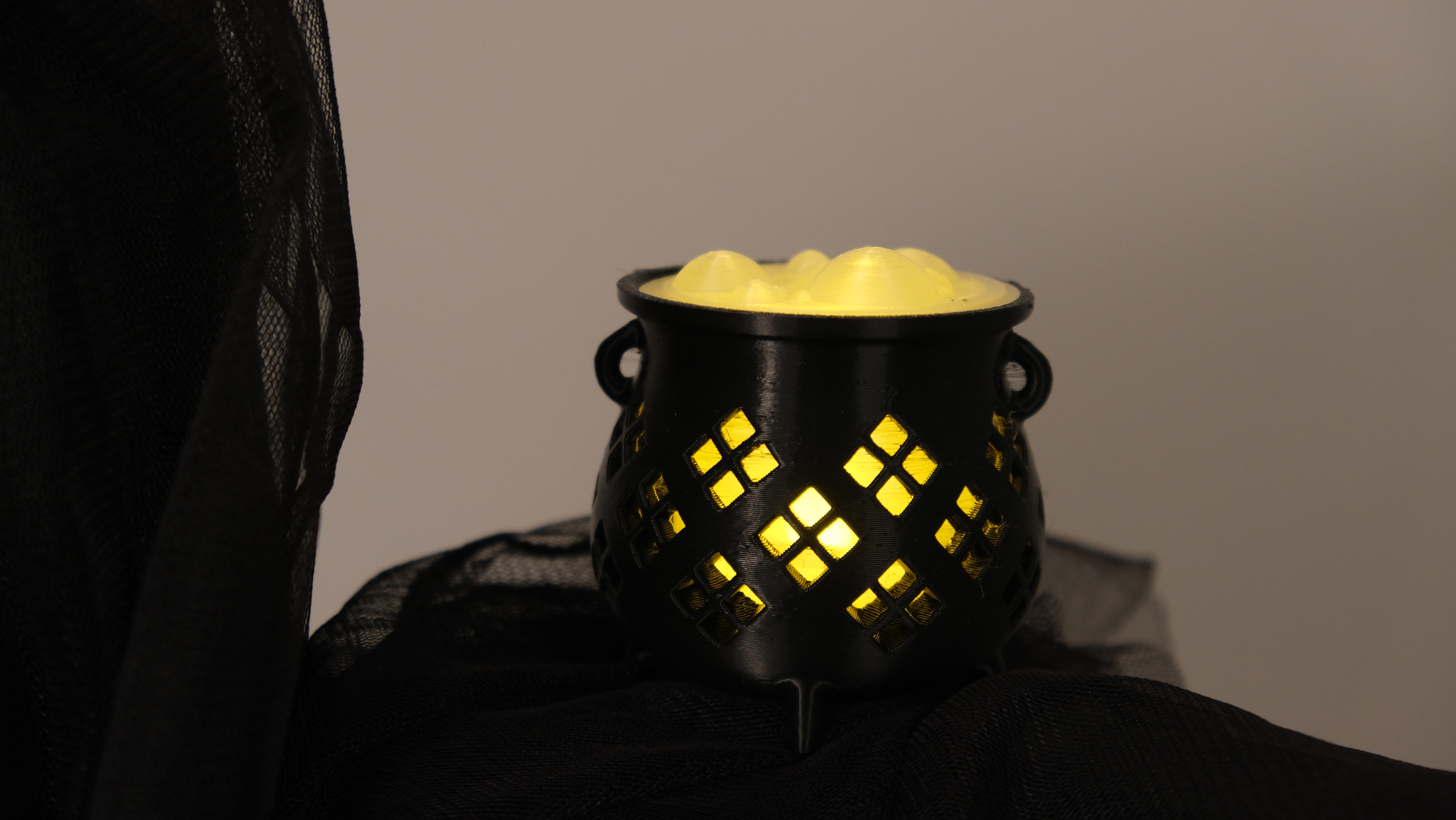 Gece parlayan cadı kazanı! ? İçine tealight koyduğunuzda ışıldayan, üst kısmı karanlıkta parlayan 3D baskı cadı kazanı ile Halloween gecesi büyülü görünecek.