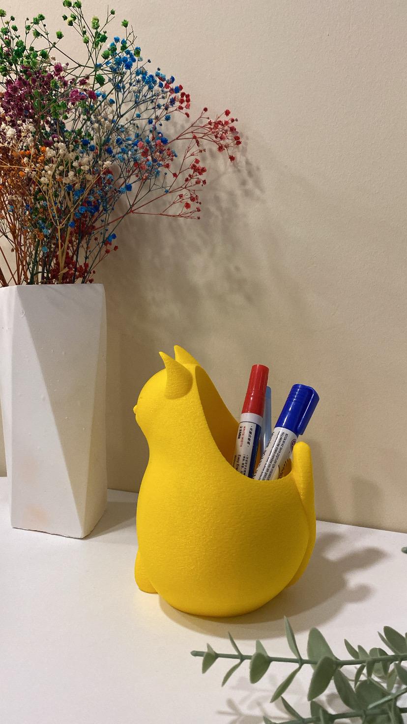 Sevimli kedi figürlü 3D baskı kalemlik. Masaüstünüzü düzenlerken dekoratif ve eğlenceli bir dokunuş katar.