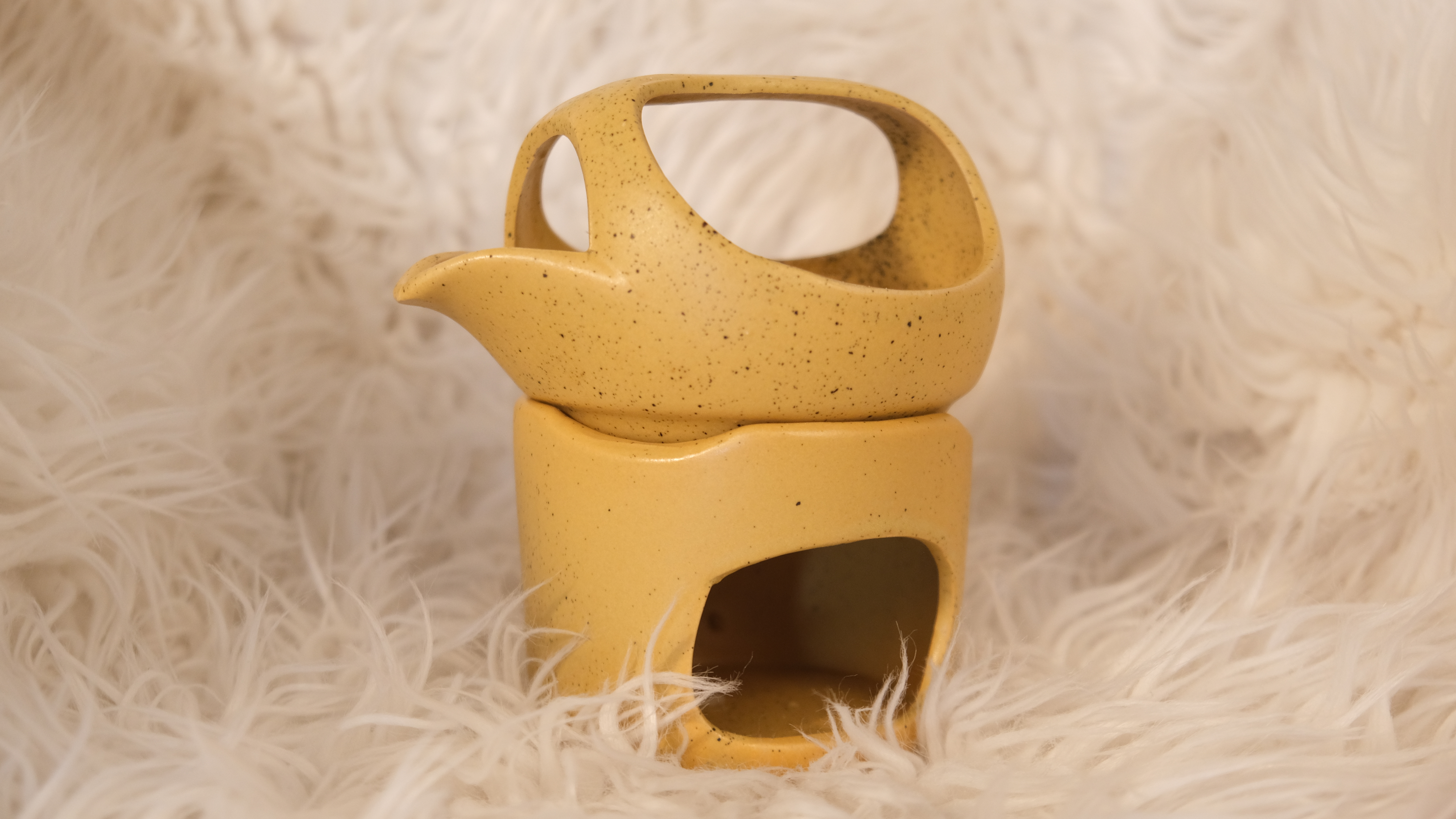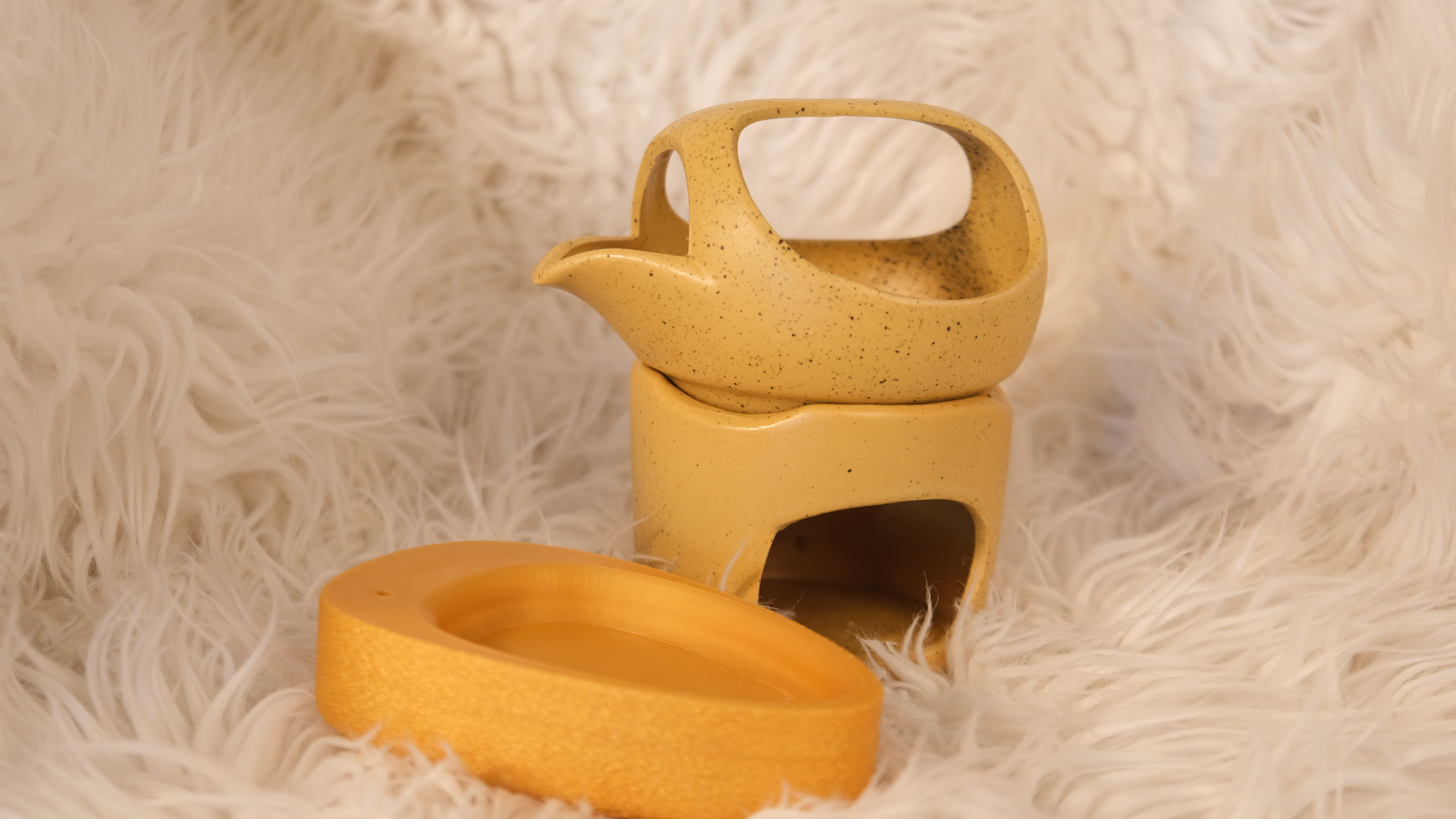Sarı-hardal tonlarındaki buhurdanlık ve tütsülük, portakal kokusu ve tütsülerle birleşerek enerjik ve sıcak bir atmosfer oluşturur.