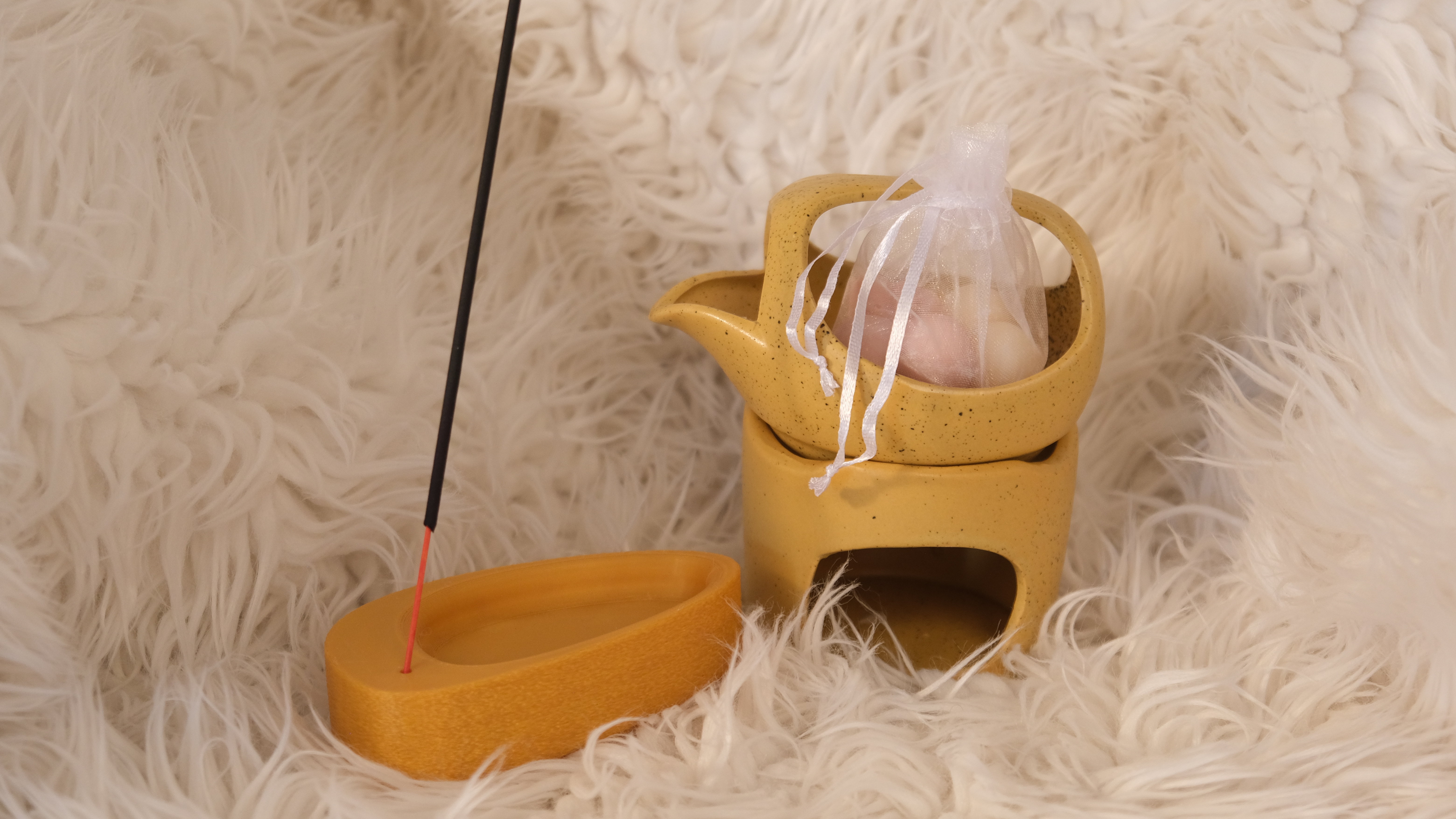 Sarı Seramik Buhurdanlık Seti | Portakal Kokulu Mum + Tütsülük + Tütsü
